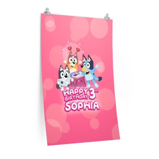 Choose a personalized Bluey Bingo Birthday Poster and decorate your kids’ room. These supreme quality print posters in various sizes serve as statement pieces, creating a personalized environment. Just provide your personal and custom birthday message and we will make it for you!