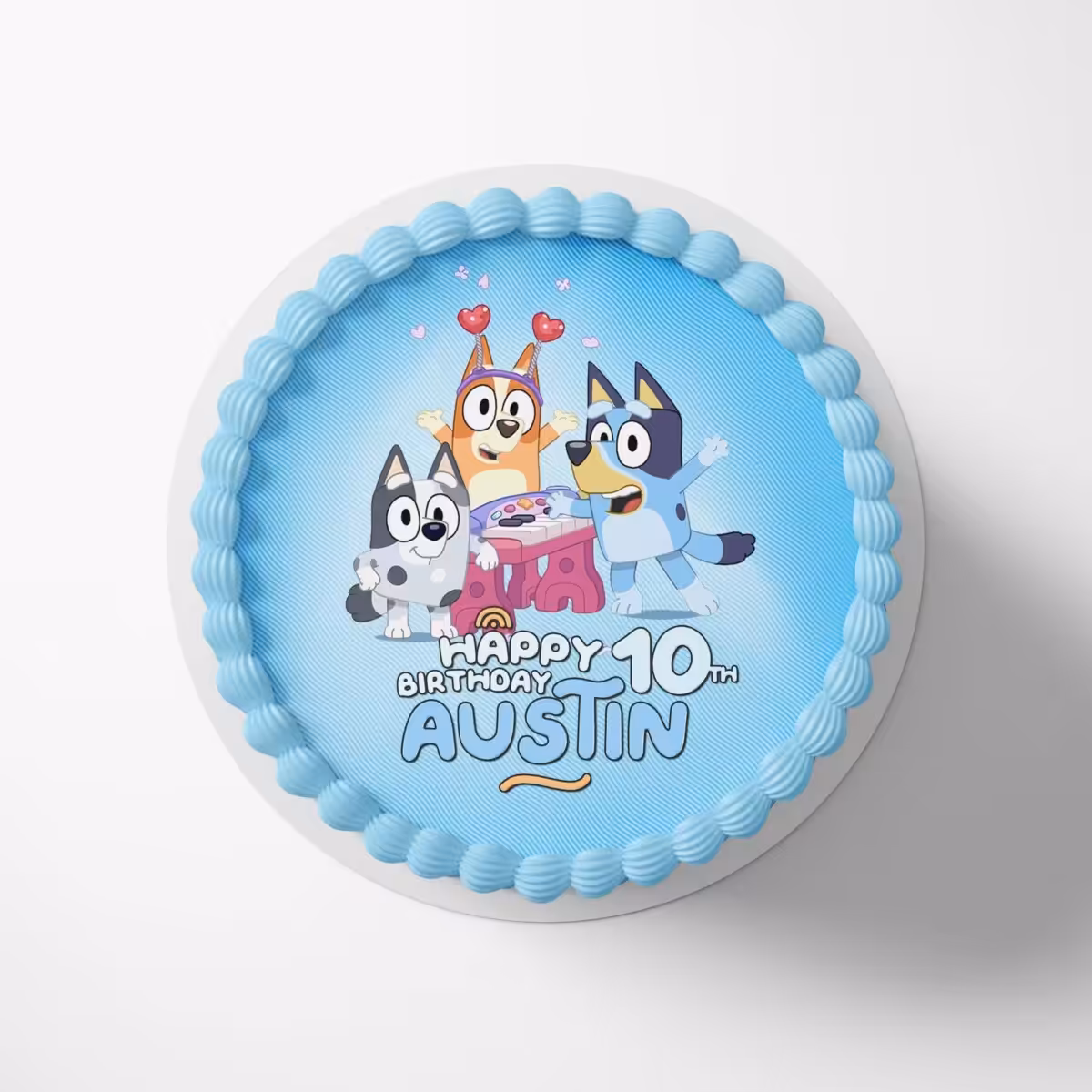 Elevate your child’s birthday celebration with our personalized Bluey cake topper image! Crafted with care, this delightful cake decoration features your child’s first name and age, adding a touch of magic to their special day.