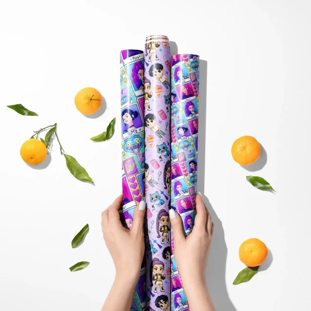 Make your next gift unforgettable. This wrapping paper is an essential for any K-pop themed party and the ultimate tribute for any fan of KPop Demon Hunters.