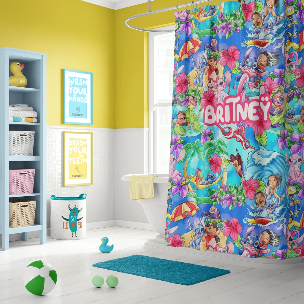 Transform your bathroom into a Hawaiian paradise with a Personalized Lilo & Stitch Shower Curtain! This vibrant and fun kids (and adults!) shower curtain is the perfect way to add a splash of island personality and “Ohana” spirit to your daily routine. Imagine the delight of seeing Lilo, Stitch, or even your own name featured on a custom shower curtain designed just for you!
