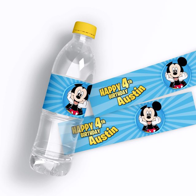 Choose personalized and printable Mickey Mouse Water Bottle Labels and transform boring water bottles into an amazing drink at a birthday party. Surprise your kids and guest and make a perfect Mickey Mouse themed birthday party.