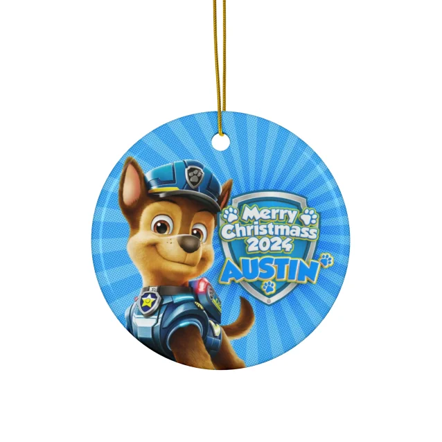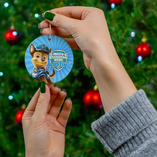 Our personalized Paw Patrol Chase Christmas ornament is the perfect way to add a touch of cheer to your holiday tree. Made of high-quality ceramic with a glossy finish, this ornament features a one-sided print of your child’s name and their favorite Paw Patrol pup.