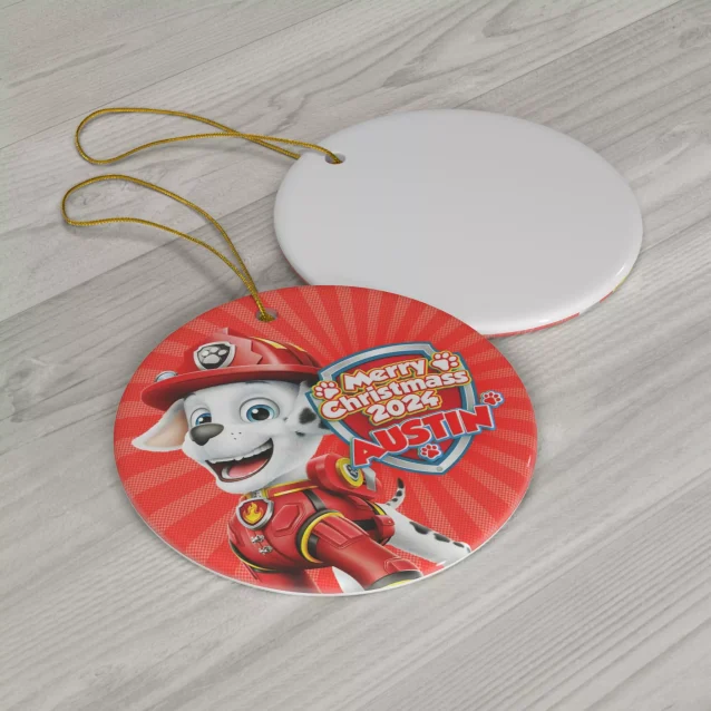 Our personalized Paw Patrol Marshall Christmas ornament is the perfect way to add a touch of cheer to your holiday tree. Made of high-quality ceramic with a glossy finish, this ornament features a one-sided print of your child’s name and their favorite Paw Patrol pup.