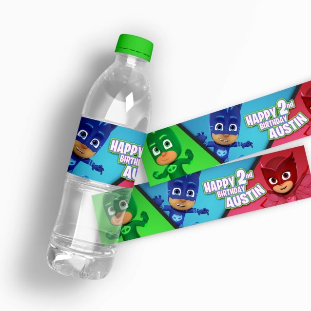 Choose personalized and printable PJ Masks Birthday Bottle Labels and transform boring water bottles into a fantastic drink at a birthday party. Surprise your kids and guest and make a perfect PJ Masks birthday party.